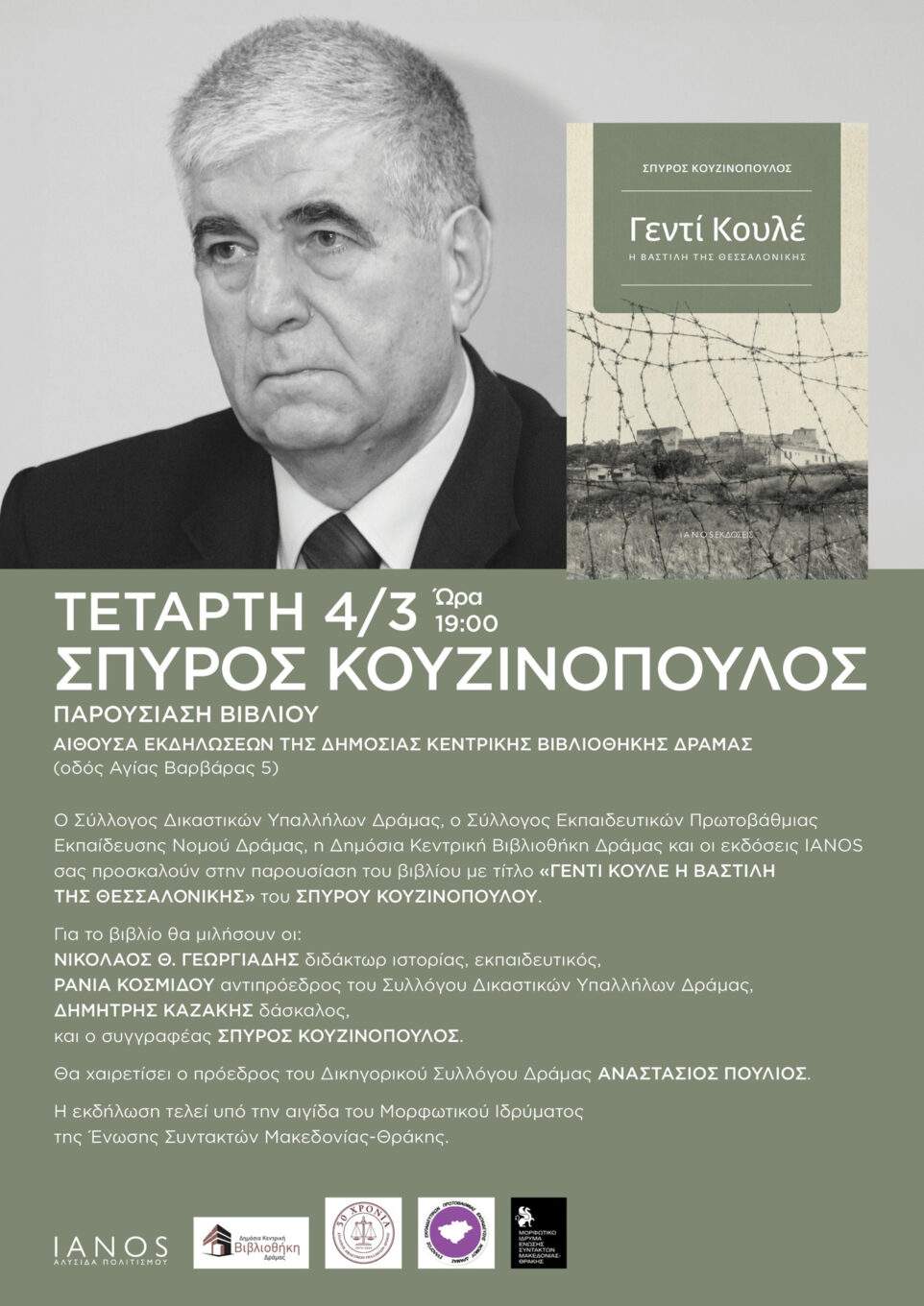 Παρουσίαση του βιβλίου «Γεντί Κουλέ, Η Βαστίλη της Θεσσαλονίκης» του Σπύρου Κουζινούπουλου Το EIDISIS24 συγκεντρώνει ειδήσεις από έγκυρες και αξιόπιστες πηγές για την καλύτερη ενημέρωσή σας. Για να διαβάσετε την
